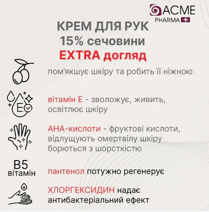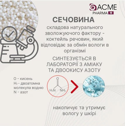 Ефективний вміст сечовини (15%) забезпечує екстремальний догляд та зволоження. Сечовина - це природний незамінний зволожувач, який є природною складовою організму. У косметичній промисловості використовується синтетично отримана сечовина. Сечовина здатна притягувати до себе вологу, в результаті чого шкіра стає більш м'якою та зволоженою, зникає сухість та лущення. Вона має високу гігроскопічність, що дозволяє речовині зв'язувати молекули води, перешкоджаючи їх випаровуванню з поверхні шкіри. Також цей компонент у складі косметики прискорює процес регенерації тканин, відлущує відмерлі клітини.